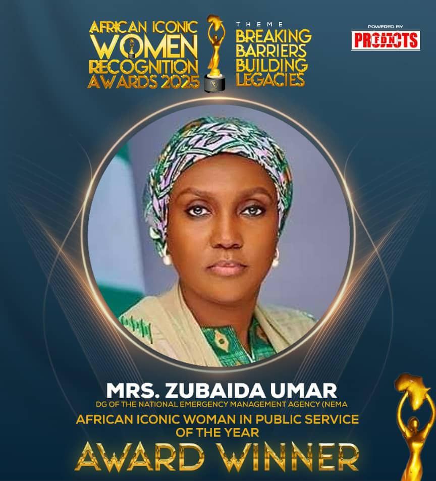 In Nigeria’s public service, where recognition often comes with controversy, few leaders shine as quietly yet powerfully as Mrs. Zubaida Umar, Director General of the National Emergency Management Agency (NEMA). At the 2025 African Iconic Women Recognition Awards held at Abuja’s Transcorp Hilton Hotel, she was honored as the Most Outstanding Woman in Public Service—a testament to her transformative leadership.The star-studded event, organized by FDN Projects, drew Nigeria’s elite—ministers, lawmakers, governors’ wives, and business tycoons. Amid the glamour, Mrs. Umar’s moment resonated most. Accepting the award from the Minister of Women Affairs, Mrs. Iman Suleiman-Ibrahim, she exuded grace and humility, earning admiration from an audience well aware of her remarkable contributions.Under Mrs. Umar’s stewardship, NEMA has evolved from a reactive agency to a proactive force in disaster management. Her leadership has prioritized coordination, community engagement, and prevention, cutting through bureaucratic red tape with quiet efficiency. From swift flood responses to aiding victims of banditry and communal clashes, NEMA has become a trusted name, arriving early and delivering lasting support. Her strategic partnerships with state agencies, international donors, and the private sector have further amplified the agency’s reach.In a landscape often defined by self-promotion, Mrs. Umar’s understated approach stands out. Her rare social media posts reflect her focus on substance over spectacle. After the award, she expressed gratitude, dedicating the honor to God, her family, NEMA’s dedicated staff, and unsung emergency responders, emphasizing that “disaster management is everyone’s business.”Leading NEMA is no small feat. Coordinating federal responses to crises, managing IDP camps, and navigating high-pressure government dynamics require resilience, emotional intelligence, and strategic vision—qualities Mrs. Umar embodies effortlessly, according to those who work with her.Her recognition signals more than personal achievement; it highlights a quiet revolution in Nigeria’s emergency management—professional, responsive, and people-focused. It also underscores the growing acceptance of women in high-stakes leadership roles, moving beyond tokenism to true impact.As Nigeria faces escalating challenges like climate change, urban disasters, and insecurity, NEMA’s role in national stability is critical. With Zubaida Umar at the helm—steady, thoughtful, and effective—the agency is well-positioned to lead. Her story proves that leadership rooted in integrity and vision speaks louder than noise, leaving a legacy that will endure